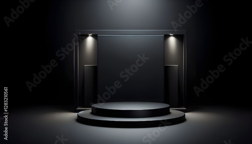 Black podium or pedestal display on dark background with long platform. Blank product shelf standing backdrop. 3D rendering.