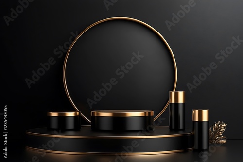 Black podium with a golden circle for product presentation on a dark background with three cosmetic tube. Vector illustration in a minimalist style,