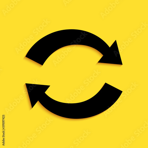 Black Refresh icon isolated on yellow background. Reload symbol. Rotation arrows in a circle sign. Long shadow style. Vector.