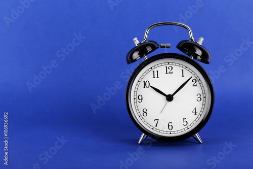 Black retro alarm clock on blue background