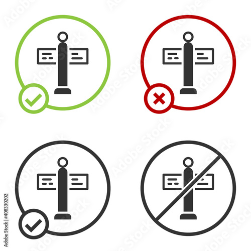 Black Road traffic sign. Signpost icon isolated on white background. Pointer symbol. Street information sign. Direction sign. Circle button. Vector.