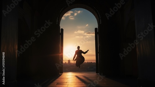 Black shadow silhoutte of man Whirling dervish under mosque door frame with sunset background, islamic background concept, eid al adha, ramadan kareem, eid mubarak. Generative ai