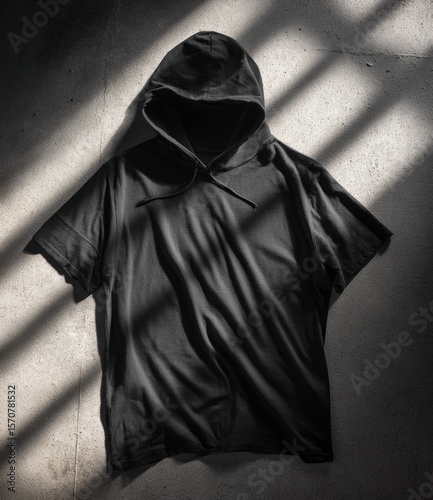 Black short-sleeved hooded shirt lies on textured floor, dramatic light and shadow accentuate its draped form, showcasing simple design