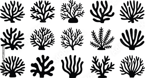 Black silhouette coral reef seaweed collection, marine underwater plants illustration, ocean coral design, tropical sea flora decoration vector set