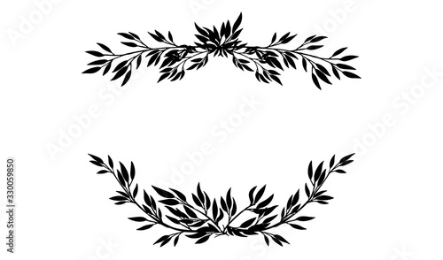 Black silhouette frame top and bottom hand drawn tree branches with leaves and berries botanical flowers floral hand drawn scandinavian style art design element flat vector illustration