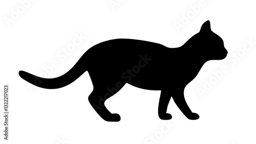 black silhouette of a cat standing in a simple pose. The cat's profile is visible, showcasing its sleek body, long tail, and pointed ears. The silhouette is outlined against a blank background.