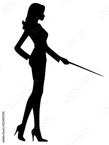 black silhouette of a hot female teacher with a pointer in her hand, attractive woman in heels, isolated on transparent background, school, teaching, vector art
