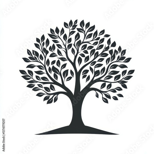 Black silhouette of a tree with detailed branches and leaves presented on a white background