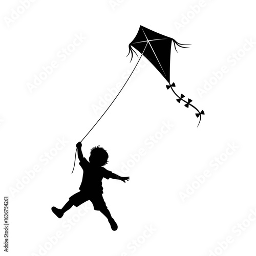 Black Silhouette of Child Flying Kite – Playful Vector Illustration