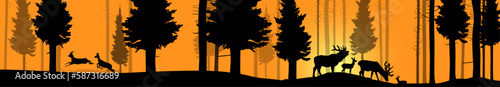 Black silhouette of wild forest woods animals deer family and forest fir spruce trees adventure wildlife hunting landscape panorama long illustration icon vector for logo, during the sunset.