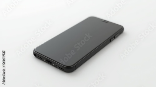 Black smartphone on a light surface, showcasing side and bottom ports, angled view