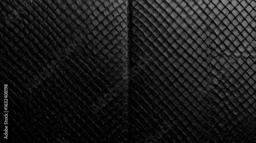 Black snake skin with a vertical seam down the center dividing the image into two reflective halves. The scales are shaped like overlapping diamonds, creating a three-dimensional effect.