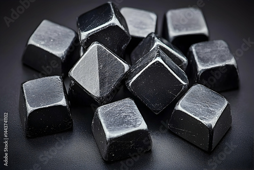 Black stone cubes on dark background; close-up; texture; design; website, game, or product background