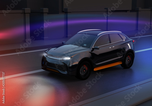Black SUV driving on the road with graphic mesh pattern retouched. night traffic. 3D rendering image.