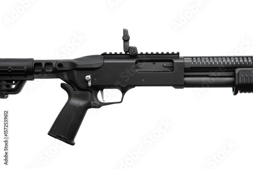 Black tactical pump-action shotgun with adjustable stock and rail system, isolated on white back