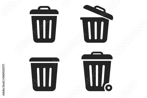 Black trash bin vector icons set. Isolated waste basket silhouettes with transparent background. Garbage can, recycling bin, rubbish container, dustbin illustration for cleaning, sanitation concepts.