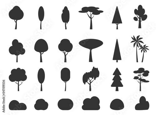 Black trees and bushes, glyph icon set. Template different shape birch, fir, palm, symbol. Collection graphic silhouette plant, forest, park, garden, simple sign. Isolated on white vector illustration