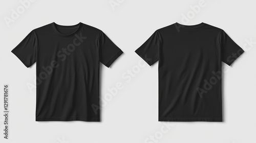 Black T-shirt template with no print, isolated on a grey background. Front view mockup for design presentation and showcase of men's or apparel.