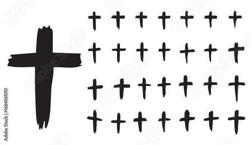 Black vector illustration of Christian crosses in distressed styles, featuring various shapes on a white background, icon sheet in grunge style
