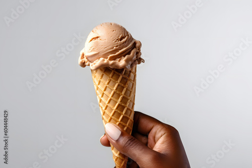 Black woman hand holding ice cream waffle cone with white vanilla ice cream scoop on a white background. Generative AI.