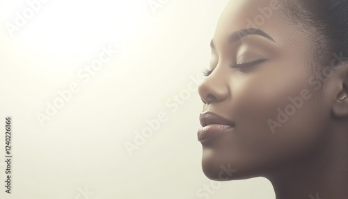 Black woman in a moment of stillness and meditation, soft and peaceful features, soft white background