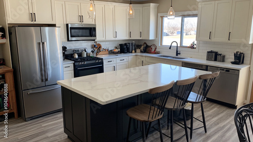 Black-and-white kitchen island setup with minimal accessories and neutral bar stools