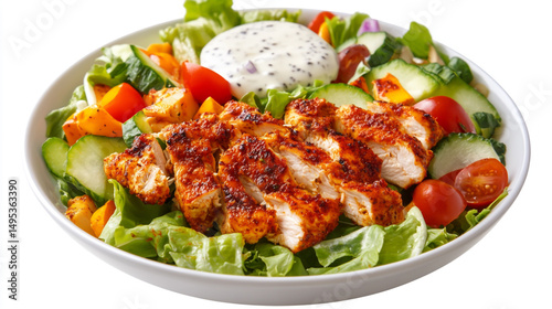 Blackened chicken salad with ranch dressing, isolated on a white background with a clipping path.