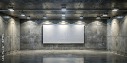 Blank billboard in a modern industrial setting with sleek lighting and a polished concrete floor
