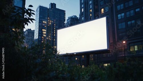 Blank Billboard in City at Dusk: Urban Night Advertising Space, Showing Modern Architecture and Cityscape Views
