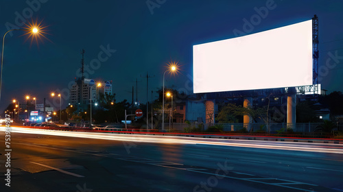 Blank billboard on the highway during the twilight with city background - AI Generated