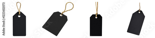 Blank black price tag with string isolated on transparent background, PNG, Set of