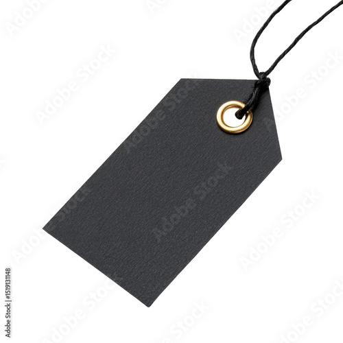 Blank black tag with a metal eyelet and string, suitable for labeling or pricing items in various contexts. cut out. transparent background