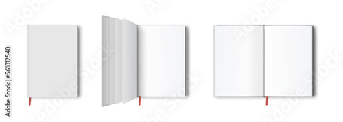 Blank book or notepad mockup. Notebook and bookmark template in different views isolated on white background, transparent shadows. Realistic blank booklet cover, brochure surface 3d vector set.