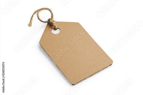 Blank brown kraft tag, twine loop, white background, retail pricing