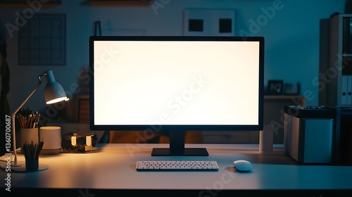 Blank computer screen on desk at night.