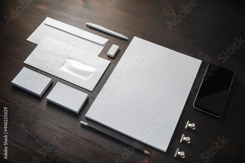 Blank corporate stationery set on wood table background. Template for branding design. Branding mock up.