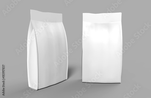 Blank Foil Or Paper Food Stand Up Pouch Snack Sachet Bag Packaging. 3d render Illustration Isolated On White Background. Mock Up, Mockup 3d Template Ready For Your Design