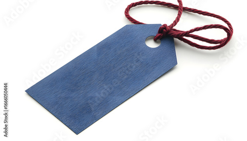 Blank label tag in sapphire blue paper stock, tied with deep ruby silk cord