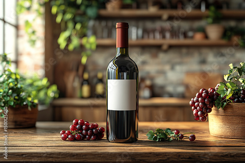 Blank label wine bottle set on wooden table with grapes and green plants in a rustic kitchen