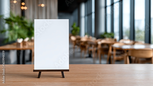 blank menu frame mock up stands on wooden table in bar restaurant white paper acrylic card for booklets for customer text insertion clean modern illustration copy space