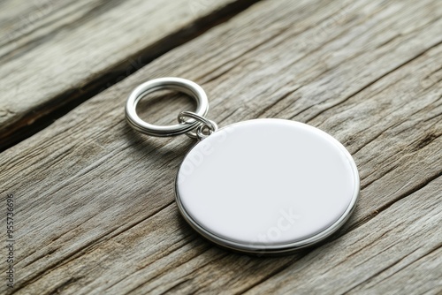 Blank metal keychain on wood. Perfect for adding your own text or logo for branding.