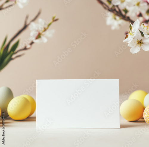 Blank mock up card in a festive arrangement with colored Easter eggs and spring flowers