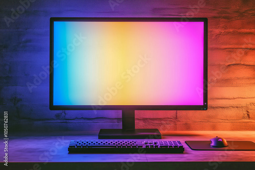Blank mockup of a monitor in a gaming setup with colorful LED lights