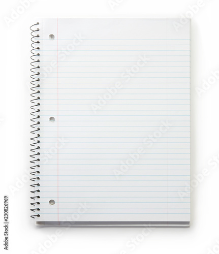 Blank note book with three ring binder holes and red margin line, isolated on white.