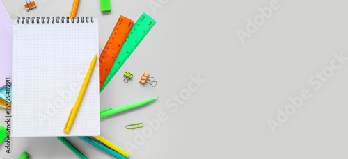 Blank notebook and different stationery on grey background with space for text