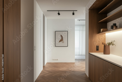 Blank poster mockup on a wooden shelving unit background. 3D Rendering