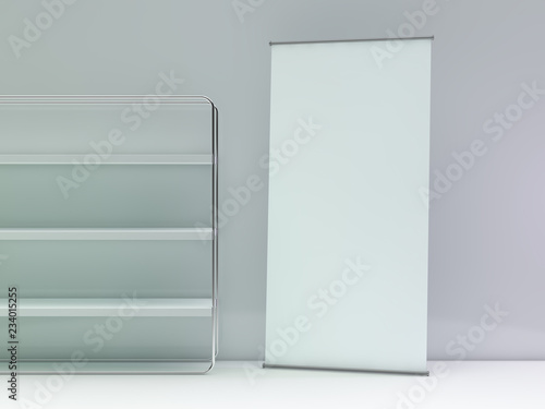 Blank roll up banner display. Template mockup. 3D