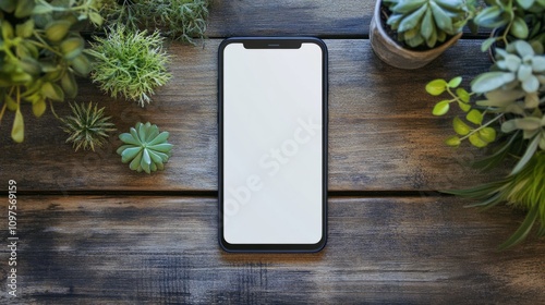 Blank smartphone mockup on a rustic wooden surface with small decorative plants adding a natural touch