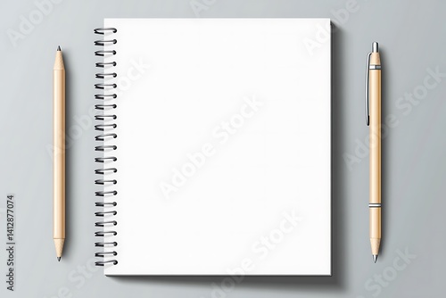 Blank Spiral Notebook with Golden Pens on Gray Background – Minimal Office and School Stationery JPG for Writing and Planning notebook, blank notebook