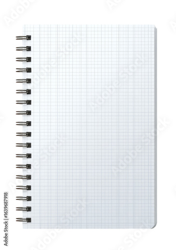 Blank spiral-bound notebook. Grid paper. Empty pages. Ready for notes